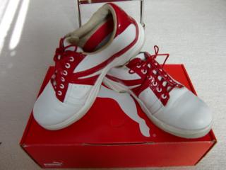 おはようございます。Kちゃんです。髪の毛サラサラのショートボブを 目指し伸ばし続けていたのに、最近の暑さに我慢できず、切ってしまった・・・・髪の毛は、短く!!やっぱり・・これだね!!(;´Д`)を 掻いても気にならなくなった!!(*´д`*)キモチイイーです。しかし・・・カラーは、苦しかった・・・いくら冷房が効いていても・・・「我慢大会」ですわ!!話は、変わって・・・前回の恵庭は、久しぶりの歩き!!今まで愛用してた、パワーバンドがボロボロになってきたので、買ってから数回しか履いていない、ツアーステージを 履いてみた!このシューズ、履いた感じはいいのですが、足首の踝に当たって痛いんですよ!!靴が大きめだから、紐の閉めすぎって事なんでしょうけど・・・・軽くて履きやすいと思ってたのですが・・・ラウンドを 終えると・・踵両方に靴擦れ!!靴の中で遊びすぎるんですよ・・・あまりにも「この靴は、でかすぎる!!」とか文句言い過ぎたのかも知れない!!夕方、主人から電話が着まして・・・「帰りに丸井に行くんだけど、来るかい?」「丸井?・・・行こうかな?」ってな事で、待ち合わせしましたわ!!いや~心の中じゃ・・・「夜ご飯は、暑いし・・・弁当にするか!!」これが、一番の私の目的。「丸井の何処の売り場に行くの?」って話!!「プーマに用事があるんだ!」ふ~ん・・・プーマか・・・なにが欲しいのかな?って考えましたわ!!プーマのゴルフシューズの前で立ち止まって・・・「どれがいいんだ!!」って主人に言われた。「靴、買ってくれるの??」って驚きましたよ!!目移り、目移り・・・結局、これに決定!!迷ったのは、10分くらいですけどね。今までプーマのシューズ、欲しかったのですが、サイズが無くて諦めていたけど、今回から、22.5もある。主人は、事前に電話で、22.5の在庫があるか聞いたらしい・・・本当は、これのピンクの在庫を 確認したらしいけど、私は別な方を 選んだらしい・・・これ以上小さい靴は、ないから、大きめでもしょうがない!!5日のシャトレーゼ石狩も歩きだから、また靴擦れしたら可愛そうだ!!と言うことで買ってくれた!!嬉しいですよ!!また、1つプーマが増えましたよ!!靴って長く歩かないと分からないですよね!痛くならなければいいな~5日のコンペは、さらに楽しみになりましたよ!!今日も張り切って練習しますわ!!
