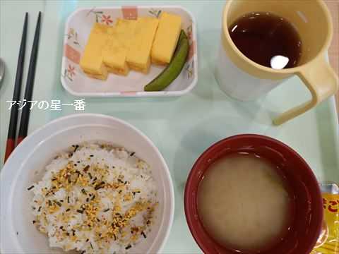朝食です。ふりかけご飯、味噌汁、玉子焼き、お茶です。