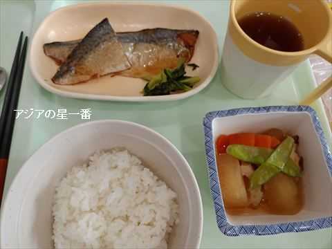 昼食です。ご飯、煮魚、大根人参の煮物、お茶です。