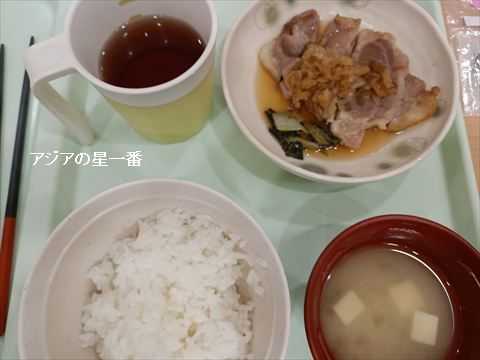 夕食です。ご飯にポーク、味噌汁にお茶です。ポークは美味しかったです。