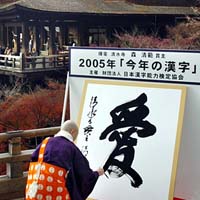 2005年の世相を象徴する「今年の漢字」に「愛」が決まった。ご成婚にアイちゃん、そして愛・地球博、なるほど「愛」ある一年だったんだと思いつつ、地球規模の大災害や凶悪事件など「愛」に反した一年でもあったような気もする。夕食で、久しぶりに家族全員が揃って「自分にとっての今年の漢字は何?」が、話題になった。色々と悩んでいる姉は「難」、一段落した妹は「楽」、子供のことで「神さま仏さま」と祈願していた家内は「願」だそうだ。で「父さんは?」と尋ねられてもとっさに思い浮かばない。「仕事で疲れた。」から「疲」とか、「ビールがうまい。」から「麦」とか、今この瞬間の気持ちはわかるんだけど、一年を通してとなると「なんだろう。」となる。ただ、仕事上で厳しい時代になっている中で、なんとなく「光」が見えてきたような気もするので、期待も込めて「光」にでもしておこう。ちなみにウチの愛犬ラルクは最近太っているので「太」と「犬」を合体して「太`」に満場一致で決まった。