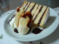 シフォンケーキを作りました。私はシフォンケーキを作るのは苦手でなかなかふくらまないのですが今日はうまくいきました。型からはずすのに苦労して、表面が見苦しくなりました。上だけシュガーパウダーで目隠しです(^^;)ホイップとバナナを添えていただきました。シロップをかけるか、チョコをかけるかで悩んで、今日はチョコにしてみました。