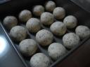 これは人にあげようと思って焼きました。どんなパンが好みかわからなかったので素朴なパンにしようと思い、三つ子パンに黒ゴマ・白ゴマ・けしの実・パンプキンシード・ひまわりの種・コーンミールをトッピングしました。なんとしたことか・・・うっかり二次発酵させすぎてしまい、ちょっと膨らみが悪いです(^^;)パン作りもなめてかかるととんでもないです。丁寧に作るときれいな仕上がりになるし、急いで作ると失敗・・・パンにちゃ~んと心が表れますね。準備万端にしてパン作りに専念できるよう心がけようと思いました。【材料】・はるゆたか100% 300g・きび砂糖 大さじ3弱・バター 30g・塩 小さじ1/2弱・水 145ml・ホシノ天然酵母生種 大さじ2