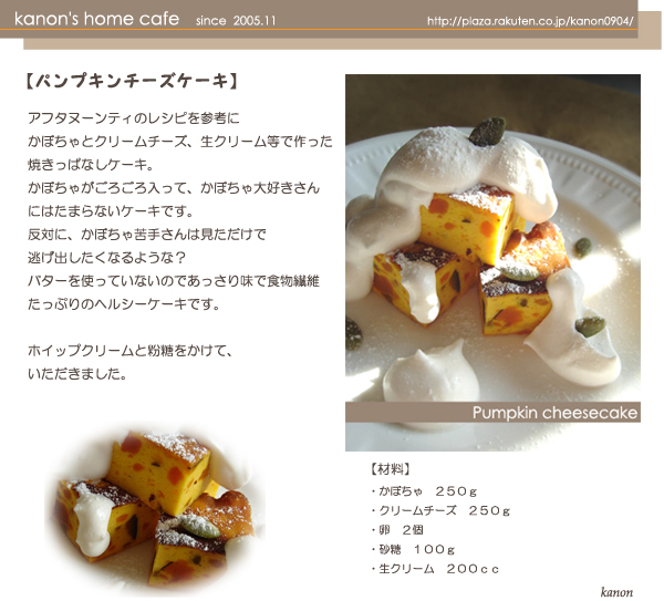 これ・・・・日記を編集してる時に気がついたけど、薄力粉入れ忘れてる材料に、「薄力粉 15g」って書いてありました。。。でも、本の作り方の工程には何度読み返しても薄力粉を入れるところがないんです。薄力粉を入れた味も食べたかったなぁ~15gじゃぁあまり変わらないかな?今日は、スクエア型で焼きました。材料もシンプルなので、味もシンプル。かぼちゃとチーズって感じです。決してマズイわけじゃないんだけど、また絶対作りたい!という訳でもありません(笑)普通に美味しかったです。↓レシピはこの本に載っています。Afternoon Tea time昨日、父親から電話があって、「明日よー、建前だで暇だったらいりゃー」 と。(私の実家は只今家を建てています。)いりゃーって・・・・久しぶりに筋金入りの名古屋弁を聞いた感じ(^^;)にしても、私の足となるのは結婚と同時に買ったママチャリです。片道20分で、簡単に行ける距離でもないけど行けなくもない・・・どうしよう?別に私が住むわけじゃないし、行ったところでなぁ。。。。迷った末、15時半ごろに行こうと決めて自転車で向かいました・・・・・でも!そこまでたどり着く道のりを想像したら・・・やっぱり遠くて急に行く気がなくなり、引き返してきました。そもそも、建前って何かやるの??(無知です)と思ってネットで調べてみた。もしかして、お餅とか投げたのかな!?・・・・まさかね。厨房の家が、10/21(土)AM0時~10/22(日)23時59分まで全品送料無料!入り口はこちらから。楽天市場に、お菓子材料マートが出来ましたお買い得情報はこちらから blogランキング参加中。応援してね♪↓愛の1票お願いします
