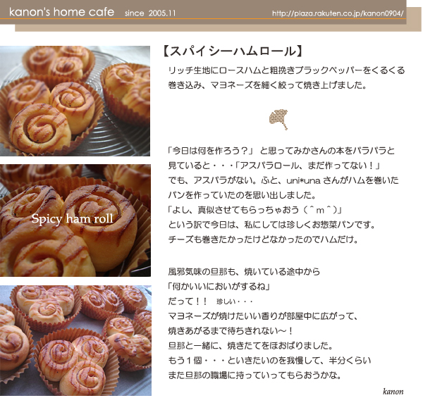 やっと焼きました。。。竹輪とパンのコラボず~~~っと前、確かゆーちゃんRSさんのところで竹輪パンを見かけて衝撃を受けました(違ってたらごめんなさい)。竹輪大好きな私は、焼きたいと思いながらも後回しに・・・・。最近、いかぽんままさんのところで見かけて、無性に食べたくなって焼きました。 みかさんのソーセージパンの成形を真似して竹輪を埋め込み、上に明太子とマヨネーズを混ぜたものをたっぷり塗って焼きます。焼きあがったら、お醤油を塗って海苔を散らして出来上がりやっと念願叶って、もう最高に美味しかったです~~昨日・今日とダンナが家にいたので、思うようにパソコンが使えず。。。我が家は一応1人一台パソコンがあるのですが、ネットがつながる線が1つしか無い為にお互い 奪い合い 譲り合いで・・・。ダンナは夕方から職場に出かけたので、やっと私のゴールデンタイム昨日は、 スーパーナチュラルというドラマを観ました。ご存知ですか~??兄弟で悪霊退散するストーリーですが、結構残虐なシーンも出てくるので、目をそらしたりしながら観ました。でも、実は結構ホラー好きです。昨日、ダンナと話してた時のこと。私が、(ダンナの職場に)「今度は何パンを焼こうかな?」と言ったところ、「うちは残飯処理だから何でもいいよ。置いとけば何でも食うから。」 ですって~~~残飯じゃぁないんですけど~~~~相変わらず毒舌なダンナです・・・。そうそう、昨日めでたくカウンターが50000を超えました!!いつもいつも訪問してくださる皆様、本当にありがとうございます。今回カウプレはありませんが。。。これからも、私の食いしん坊日記にどうかお付き合い下さいね。明日は、お友達とランチへ行ってきますお買い得情報はこちらからぶーらんじぇで、5000円以上送料無料! blogランキング参加中。応援してね♪↓1日1回クリックお願いします - Designed by tickle*tickle -