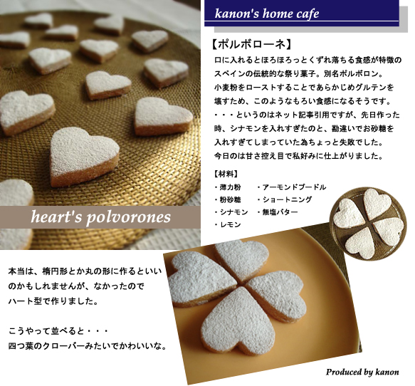 昨日作ったスペイン生まれのクッキー、「ポルボローネ」。先日、コーヒーkajitaさんの物を食べたらすごく美味しかったので、作ってみたくなりました。最初に薄力粉だけをオーブンで茶色になるまで焼いてから作ります。ほろほろと崩れる食感だけどしっとりしていて、シナモンもきいてすごく美味しい~ 今回、シナモンをちょっと入れすぎて色も濃くなっちゃったので、次回は少な目で作ろうかな。それから、kajitaさんのは和三盆を使っていたので、それもいつか作ってみたいです。レシピはコチラお菓子大百科(1)さて、昨日のクレセントクッキーですが、sachiさんから小嶋ルミさんのレシピだという事を教えていただきました 本を探してきて、今度はそのレシピで作ってみたいなぁ 只今全品送料無料今日もとってもいいお天気世間は3連休で、運動会が行われているところも多いですね。そんな中、私はブログ(笑) あっ、でも明日はバーベキューに行く予定です バーベキューなんて10年ぶりで、何を準備していいかわからないけど、相手方が全部用意してくれるとのことなのでドリンクだけ持参して行ってきますお買い得情報はこちらから blogランキング参加中。応援よろしくお願いします!↓クリックしてネ - Designed by tickle*tickle -