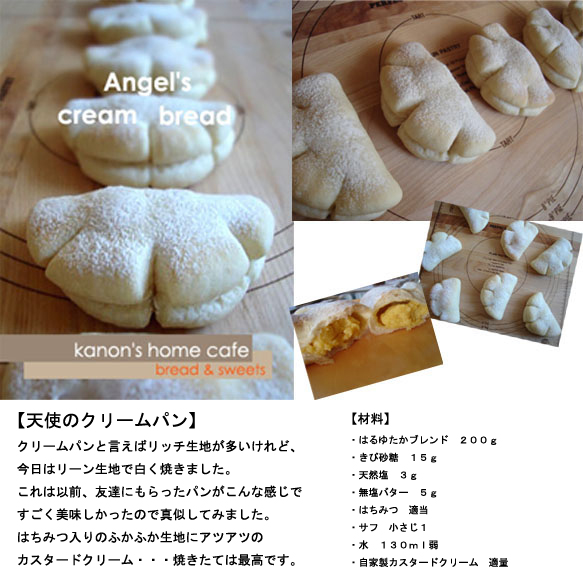 写真がエスカレートしてますが(笑)時間がかかるから滅多にやらないやれないけど。。。これは昨夜焼きました。リーン生地だけどお砂糖多めに入れてはちみつも入れてほんのり甘さを出しました。カスタードクリームは、みかさんのクリームパンのレシピ。卵黄・牛乳・薄力粉・バター・お砂糖をレンジでチン個人的にバニラビーンズも入れたかったけど、どうやらいつものスーパーは取り扱いをやめたようで買えなかったから無し。焦がしたら天使じゃなくなっちゃう!と思って、途中からオーブンに張り付いて低温でじっくり焼きました (とは言っても、結局3個くらいは茶色くなっちゃったんだけど)天使のクリームパンだなんて勝手にネーミングしたけど、これは某パン屋さんに「天使のおしりパン」とかいう名前の白いクリームパンがあったのを思い出したので(友達にもらったのとは違うパン)何となく似せました。8個焼いて、その内6個はまたまた旦那の職場へ持っていってもらいました。本当は全部自分で食べたいのやまやまだけど・・・すぐに違うパンが焼きたくなっちゃう&食べたくなっちゃうから、消費が追いつかずそろそろ旦那の職場の子達もうんざりしてる頃かな!?(笑)お気の毒に…お買い得情報はこちらから blogランキング参加中。下降気味(T~T)応援してね♪↓1日1回クリックお願いします - Designed by tickle*tickle -