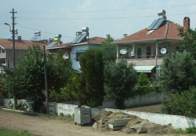 トルコ観光でバスの中から見たトルコの住宅の印象です。屋根はすべてレンガ色法律で規制しているわけではないらしい。屋根に太陽熱温水器を設置よく目立ちました。家の内部はどうなっているのでしょうトルコじゅうたんを敷き詰めているのでしょうか。多いのは2階建て、日本と一緒ですね。構造はなんでしょうね、木造・鉄骨、あるいは組積造屋根の温水器イスラムの教会を囲む集落田園地帯、高速道路と平行に家があります。都市では密集しています(アンカラ)同上上空(気球)から見たカッパドキア地方の住宅低層住宅と高層住宅広い国土で土地はいくらでもありそうですが丘の上まで開発されていますカッパドキア地方にはこのような岩山を利用した洞窟の家が多い。キリスト教徒が隠れ住んだ巨大地下都市まであります。旅行会社は、洞窟ホテルや洞窟レストランを売りにしている。傾斜地の高低差をうまく利用して前面を庭に洞窟の家内部近くで見るとこんな家もあります。トルコも日本と同じ地震国、心配ですね。工事中の家、囲いのシートの絵柄が面白い