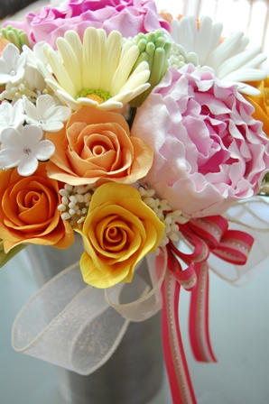 午前はGさま。午後は先週に引き続きAさまOさまがお見えになられました。Gさまは6月の挙式のご友人のために冬に足しげく通ってくださり、素敵なバッグブーケを完成された生徒さんです。今度はご自身の挙式のために。。。なんて素敵なお話でしょう。和装にもドレスにも合うブーケを作ることになりました。頑張って作りましょうね。とってもお幸せそうなのですが、あまり根を詰めてなさると体調を崩しかねませんものね。お手伝いいたしますので、遠慮なくおっしゃって下さいね。午後からお見えになられたお二人は、今日でフラワー1を終了できました。フラワー2の宿題の多さに、うへぇ。。。って(笑)ここからがクレイの面白いところなんですよ。急がなくていいので、素敵な作品をしっかり作リ進めてくださいね。お二人のエンジェルです。目を入れるのは難しいですが、どことなく本人に似た?お顔になりましたね。Oさまのブートニアとコサージュです。まだ作りたてほやほやのお花でしたので、もう一つは次回に組むことになりました。まずはトピアリー。たくさんのお花を作ってくださいね。そして。。。お母さんたちがレッスンを受けている間に、Eちゃんが素敵なティッシュBOXを完成してくれました。春夏秋冬のトトロのシールが貼られて、とっても素敵に仕上がりましたね!!!