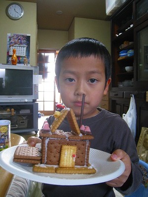鼻には刺さってませんから今年最後のお稽古 行ってきました。 今日はクリスマス後ということで お菓子の家を作ったそうで先生2人は 子供が5~6人を相手にてんてこ舞いだっだろうな~とおもいつつたあまんは、意外とシンプルですねみなさんは ポッキーがザクザク刺さってたり お皿にたくさんお菓子が乗っていたのにたあまんは 「ドア持つとこあるやろ?」「白い食べれる接着剤(アイシング)ははみ出たから、雪にしてん」と言っていました。 なるほろ、いろいろ考えているんだね