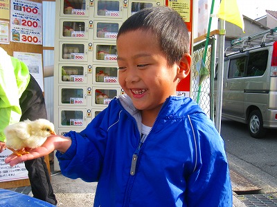 あばれうさぎさんの自販機お披露目イベントへいってきました。たあまhんはひよこを 見たことないというのでちょっと、遠いですが 見に行ってきました。最初は 手に乗せるだけでいっぱいいっぱいだったのに3時間ぐらいで、すっかり ひよこたちと仲良くなってしまいまして「帰ろう」というと「なんで?」といわれましたね~^-^寒い日だったのに、ジャンパーの下は半袖ですよΣ( ̄ロ ̄|||)近所にも卵自動販売機あったらいいな~