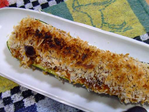 意外にウマいのよ♪~ ヘチマみたいな緑色のズッキーニ・・・ あはは(^^ゞ チーズ乗せるのを忘れたんだけど、それなりに美味しかったわ♪ 1.ズッキーニを二つ割りにして種をくり抜いたら、電子レンジで2~3分くらいチンして柔らかくしておく。 2.みじん切りの玉ねぎ・豚ひき肉・さいの目切りのナスを炒めて、塩こしょうとケチャップで味を整える。ズッキーニ自体には味がないので、濃いめの味付けにしておくといいよ。3.ズッキーニに炒めたものを詰めて、上にとろけるチーズをのせて更にパン粉を振ってオーブントースターで焼く。もうあらかた火は通っているので、パン粉がきつね色になってチーズがとろ~リとしたらできあがり♪ ダンボール箱いっぱい!農薬削減で安心できる牧子の野菜セット 2000円