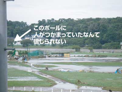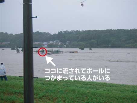 朝起きたら、もうこんな状況・・・ 河川敷に取り残された人が二人見えていたのに、一人は流されてしまった。。。(T-T)ウウウ 下流で救助されていればいいのだが・・・警察・消防や河川局の車はもともと水位上昇を見張っているから、何台も出ている。救助のヘリが来た。ヘリから救助の人がスルスルと降りてきたが、風に煽られてブランブランして非常に危険な状態になり、いったん引き上げてしまった。一方救助を待っている人は野球練習場のポールにつかまっているのだが、ポールを支えるワイヤーやロープ・ネット等が救助を遅らせているのだ。流されて来るわけのわからないゴミも次々とひっかかる。30分程してヘリが再びやってきた。強風と雨の中、レスキューの手によって助けられた・・・こんな台風の日にヘリを運転するだけでも大変だし、増してそのヘリから命綱一本でぶら下がって人を抱えて、また上がるなんて、スゴい!!!周辺から思わずパチパチと拍手が起こった。もちろんあたしも拍手してしまった。 まだ、すごい勢いでドロドロに濁った水が流れ続けている。