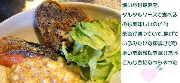 朝ご飯タルタルソースって、色々アレンジが利くσ( ̄∇ ̄;)ワテ 玉ねぎの薄切りを、かんたん酢とか寿司酢に常に漬けておく・・・便利(・・)(。。)ウン酢を絞った玉ねぎをみじん切りにして、マヨネーズと、ゆで卵のみじん切りや細ネギのみじん切りなんかその時にある素材を混ぜるだけ(笑)かけるものによっては、醤油を混ぜることも・・・卵焼き卵液さえ作れば、百均グッズで1分30秒で、出来る(笑)今日は、頂き物の錦松梅を砂糖&塩代わりにして牛乳で溶いた片栗粉液を混ぜて作ったら写真の色に(笑)ハート型の容器に流して作ったわ 季節外れのシャーベット・・・ (;-;)\オヒ! ひと月前位に、アロマティカスとカルピスを混ぜて冷凍庫に入れてあったんだけどその後、めっちゃ酸っぱいキウイを角切りにして足したどんなことになってるかと思ってf^_^; やっぱり・・・夏食べたほうが美味しいだろうと思った(・・)(。。)ウン原液カルピス7に、水3で割って冷凍保存袋に入れて、切った果物を入れて混ぜると簡単以前に、イチゴを沢山頂いたときに、思いついて4つ割りにしたイチゴをカルピスで凍らせたら美味しかったからさカチカチに凍っているから、温かい手でしばらく、袋に入ったまま揉んでから食べまっす