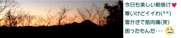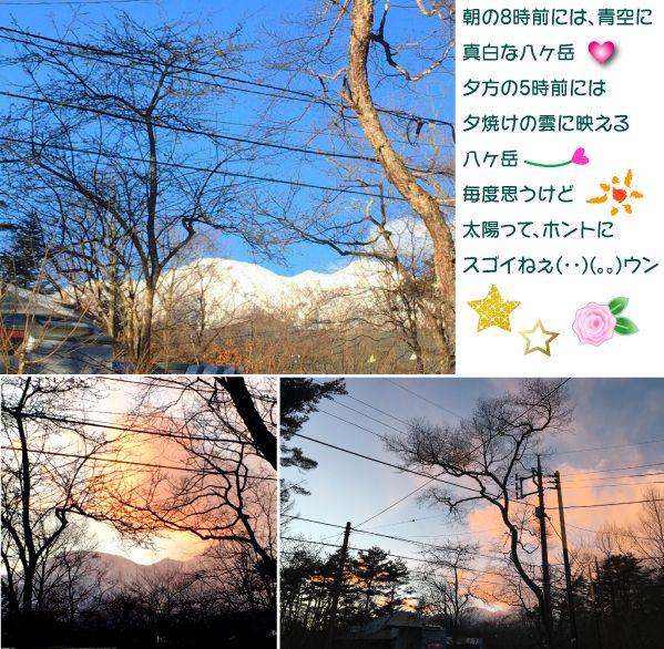 栃ノ心が優勝したね相撲界も色々だけど、一生懸命さが伝わる取り組みはイイわ下の写真・・・夕焼けみたいに見えるけど朝なんだ・・・昇ってきた太陽光が八ヶ岳や周囲の雲を赤く彩る今朝6時頃の外気温は、ー17℃だった清里の森では、毎度の気温だけどさ東京でも、結構な被害が出るくらいの寒さだものホントに寒気が来ているんだねσ( ̄∇ ̄;)ワテも凍った道路には、気をつけよう(・・)(。。)ウン