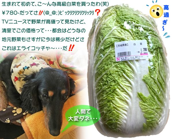 メイちゃんのドッグフードの嵩増しのために白菜のみじん切りをレンジでチンして足したりしているんだけど・・・(--、)高いわ〜この高値は、しばらく続くに違いないよね(T▽T)涙;清里で、野菜が高いと思うなんて考えもしなかった白菜・・・税込みで¥842コープの野菜が欠品だったり・・・今冬は、日本中大変なんだね(・・)(。。)ウンメイちゃん 白菜抜きになるよドライドッグフードONLYでお願いよ人間も大変だけど・・・ワンコだって大変なんだからね