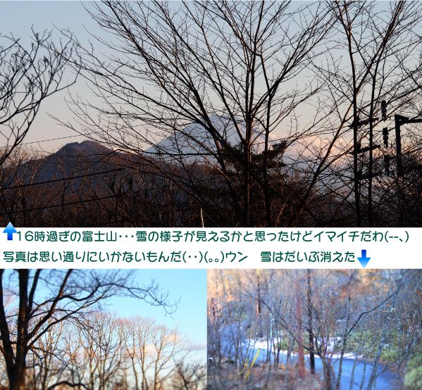 16:00頃肉眼では富士山の雪模様がうっすらと見えてるんだけどなぁ・・・カメラのせい!・・・σ( ̄∇ ̄;)ワテの腕のせいではナヒと思ひたひ!(;-;)\("-")オバカ清里の森の雪は、溶けてだいぶ少なくなった