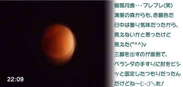 ぽちっ皆既月食夜なんだから、手持ちじゃブレるに決まってるよね(^ー^* )/アハハ♪メンドクサガッテンジャネーヨ(・0´)ノ(゜◇゜)ヘイヘイホー…三脚・・・どこにしまったのかもわからんのf^_^;