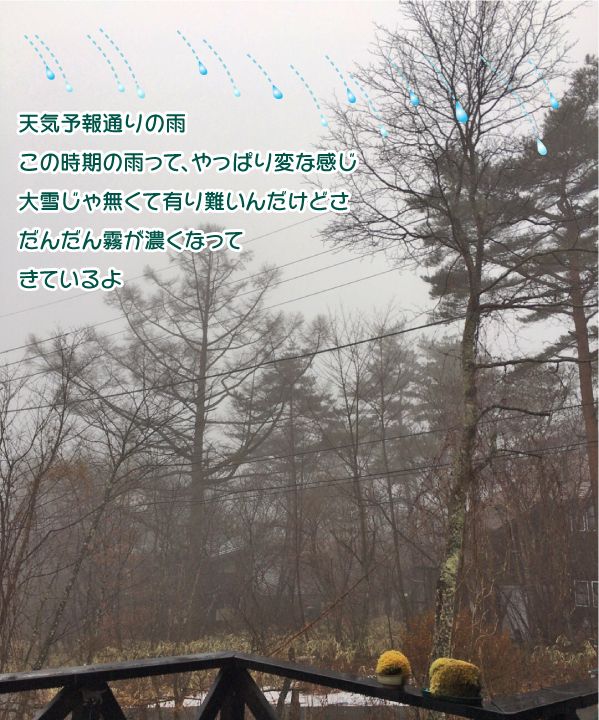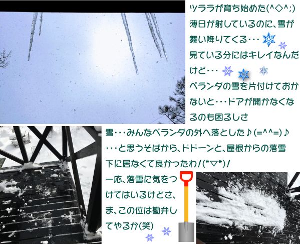 *森守人・・・「もりもりと」と読みますσ( ̄∇ ̄;)ワテが、勝手にそう呼んでいるんだけどさf^_^; 除雪してくれたり、邪魔な木の枝を払ってくれたりね清里の森の公共保全を計らってくれるんだわアリガトあらあら、またチラチラと雪が舞い始めたわ今日は、大人しく家で雪を眺めていようっと