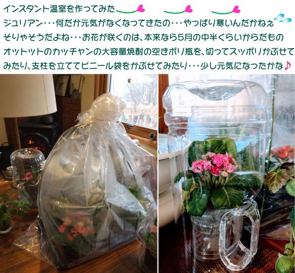あれれ??なんか元気ないねぇ・・・夜中は、部屋の中だって12℃位になるし・・・窓際に並べておいたから、もっと冷気が当たったのかもなぁとりあえず、簡易温室がんばれ〜お花さん達〜