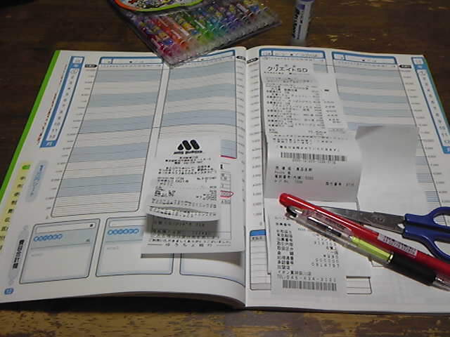 今日、本屋さんにいきました。 家計簿を買っていなかったことに気がついて・・・・ 買いました。 レシートを貼るだけです。 続くかどうか分からないけどやってみますo(`^´*) さっそくお財布のなかのレシートを貼ってみました\(^o^)/ 項目は『スーパーS』『Eスーパー』『ドラッグストアK』それから『朝葉の小遣い』(モスバーガーのレシートがそれ)『カード使用分』『分類不可』としました。 最近は節約も停滞してました。 もう一度、初心に帰って“〆(^∇゜*)♪