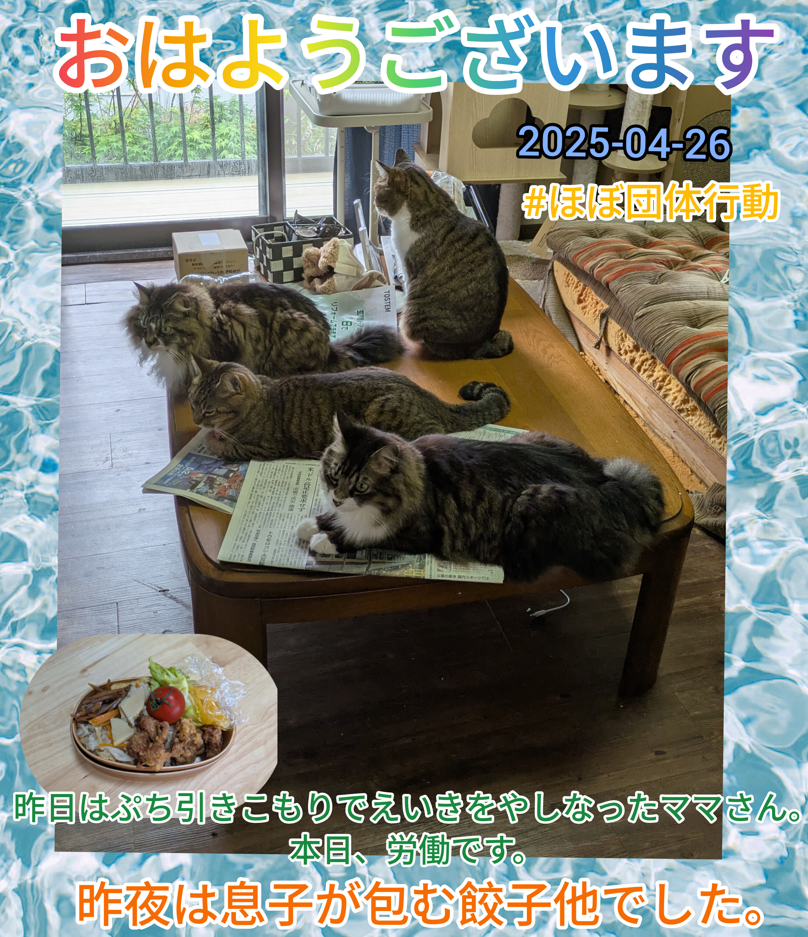 朝葉のゴールデンウィークですが、朝のご挨拶で振り返ります。労働に始まりました。所用を片付けにお出掛けしました。この日、ATMに行き朝葉パパのお給料を引き落とし、家計の振り分けをおこないました。火曜日は生協の配達日ですが、回収箱を玄関に出しておいて、配達の人に回収してもらうのを忘れてしまいます。朝葉が労働の日は誰もやりません。溜まりに溜まってしまいましたこの日、また、労働でした。黄金連休、電車がややすいてました。