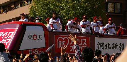 行って来ましたよ。優勝パレード。ゴール地点の五橋付近で見ようと,地下鉄に乗ったら,通勤ラッシュのような激混み。駅から降りたら人,人,人。後で聞いたら,21万4千人だったとか…。家に帰って,録画した特番の空撮を見たら,これまたすごい人。仙台で,これまでこれほどの人が1ヶ所に集まったことがあったでしょうか。とにかくめちゃくちゃすごい人だったけど,少なくとも私の周りでは混乱はなく,笑顔ばかり。見知らぬ人でも,何となく会話が弾みます。思えば40年前に幻となったロッテの優勝パレード。それを見損なった世代のファンにとっては,初めて仙台で行われたプロ野球の優勝パレード。そういう意味でも,感無量です。終わってから一番町を歩きましたが,気のせいか人が多く,いつもならそれほどでもない飲食店にも行列が。よく見ると,イーグルスグッズを身に着けている人が多数。でも帰りの地下鉄は意外なほど,ガラガラ。何だったのでしょう。とにかく,これが最初で最後とならないよう,またこの感動を味わいたいので,来シーズンからも頑張ってほしいです。なんか,この幕を畳んでいる作業が少し悲しかった…です(TT)もし、よろしかったら…クリックを。にほんブログ村