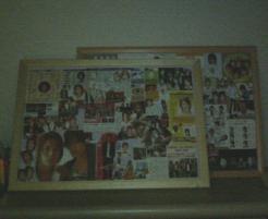 今日は久々のお休みをとっているので、しばらくたまってた亀ちゃん掲載の雑誌の整理をしている。ところで切り抜き保存している皆さん、一枚ページはファイル保存するとして、細かい切抜きはどうしているのですか?画像不鮮明にしなければならないので、暗くてすみませんが、私はこんなこと↓↓↓してます。他に数枚あります。絵やポスターを入れる額を買ってきて(もちろん安いの)、細かい切抜きをペタペタ貼っていきます。