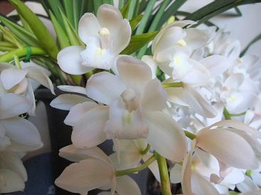 花言葉は 誠実な愛・飾らない心・・・ 我が家のシンビジウムたち アイスキャスケード ビビアン イエローシャイン 我が家の玄関 ピュアな愛であふれています ・・・なんのこっちゃ