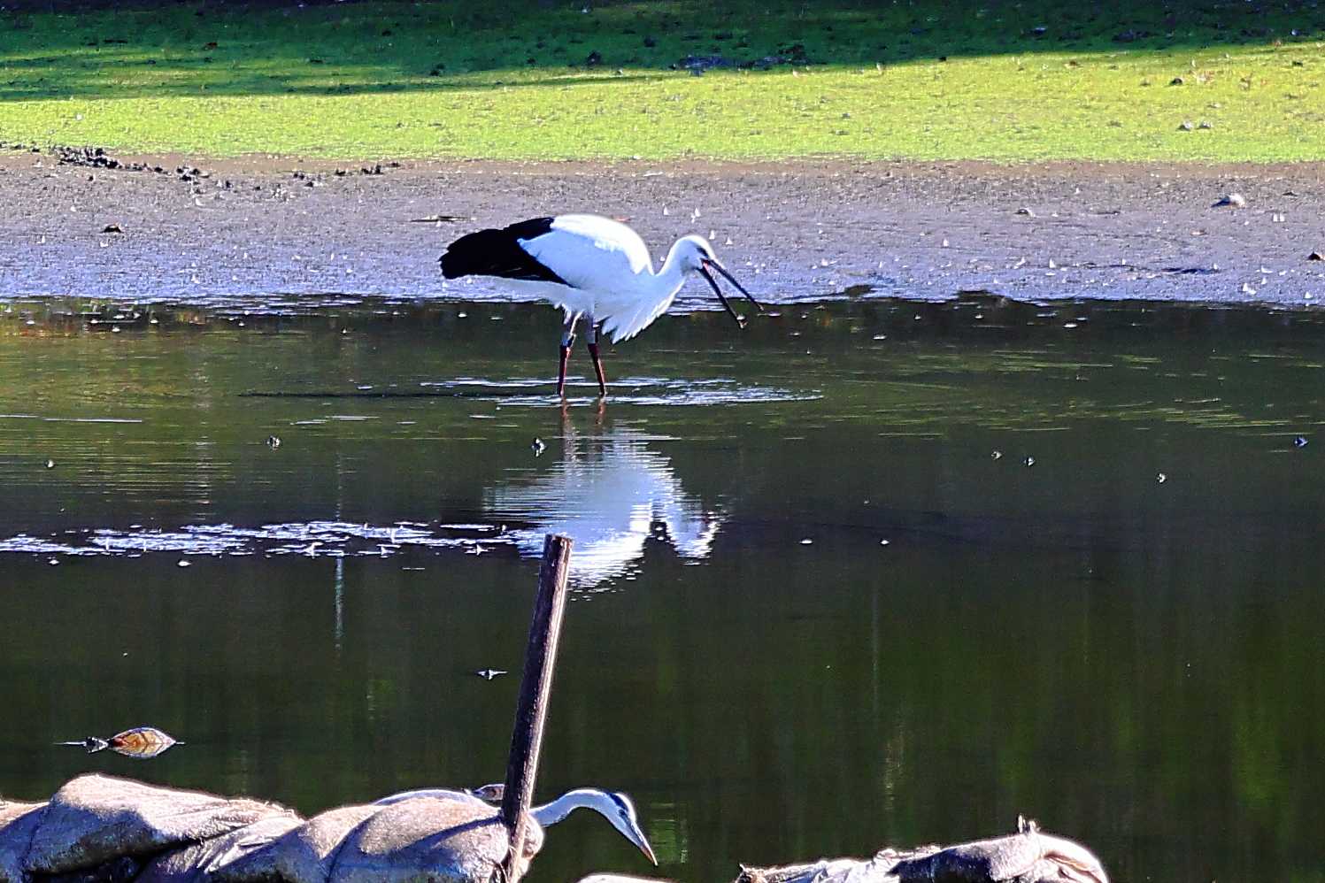 大きな池で餌を探すコウノトリアオサギに餌を横取りされて怒っています