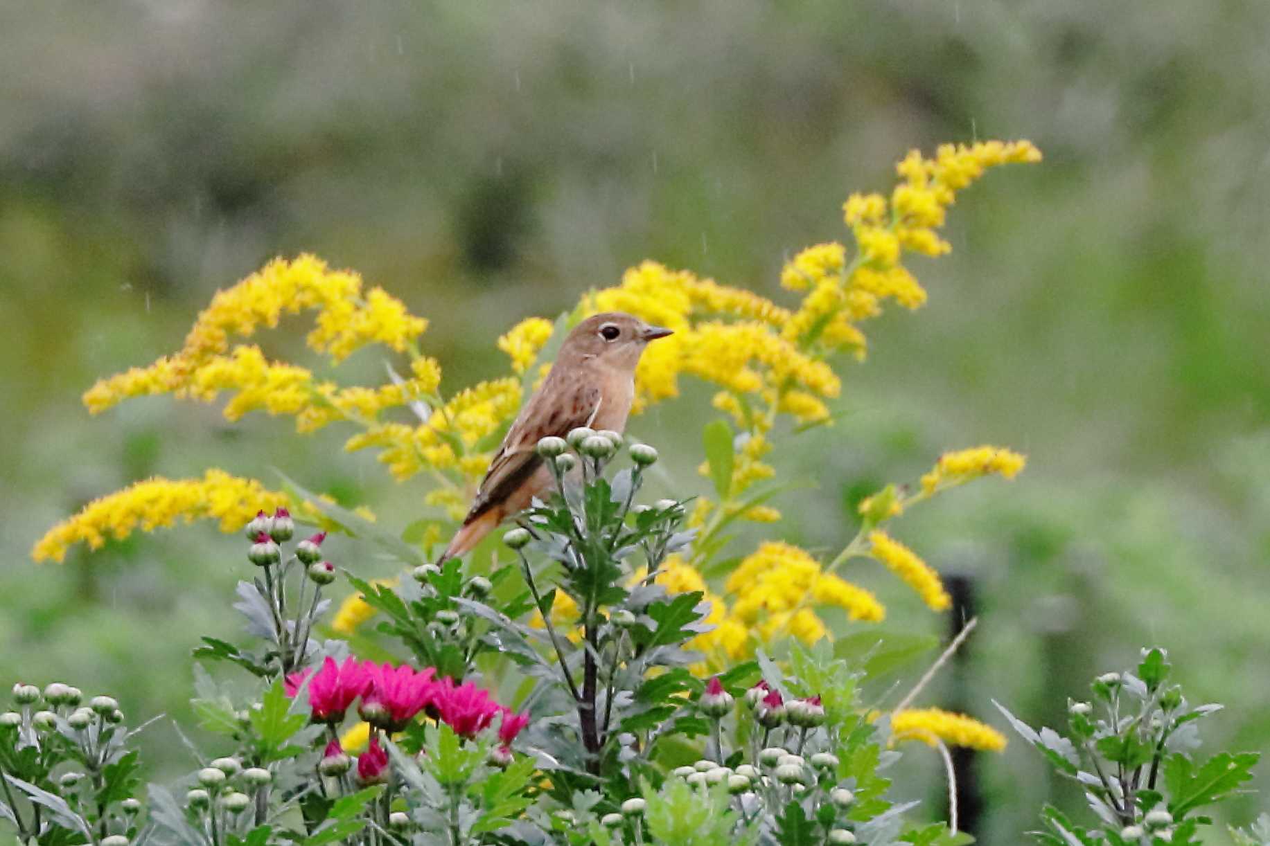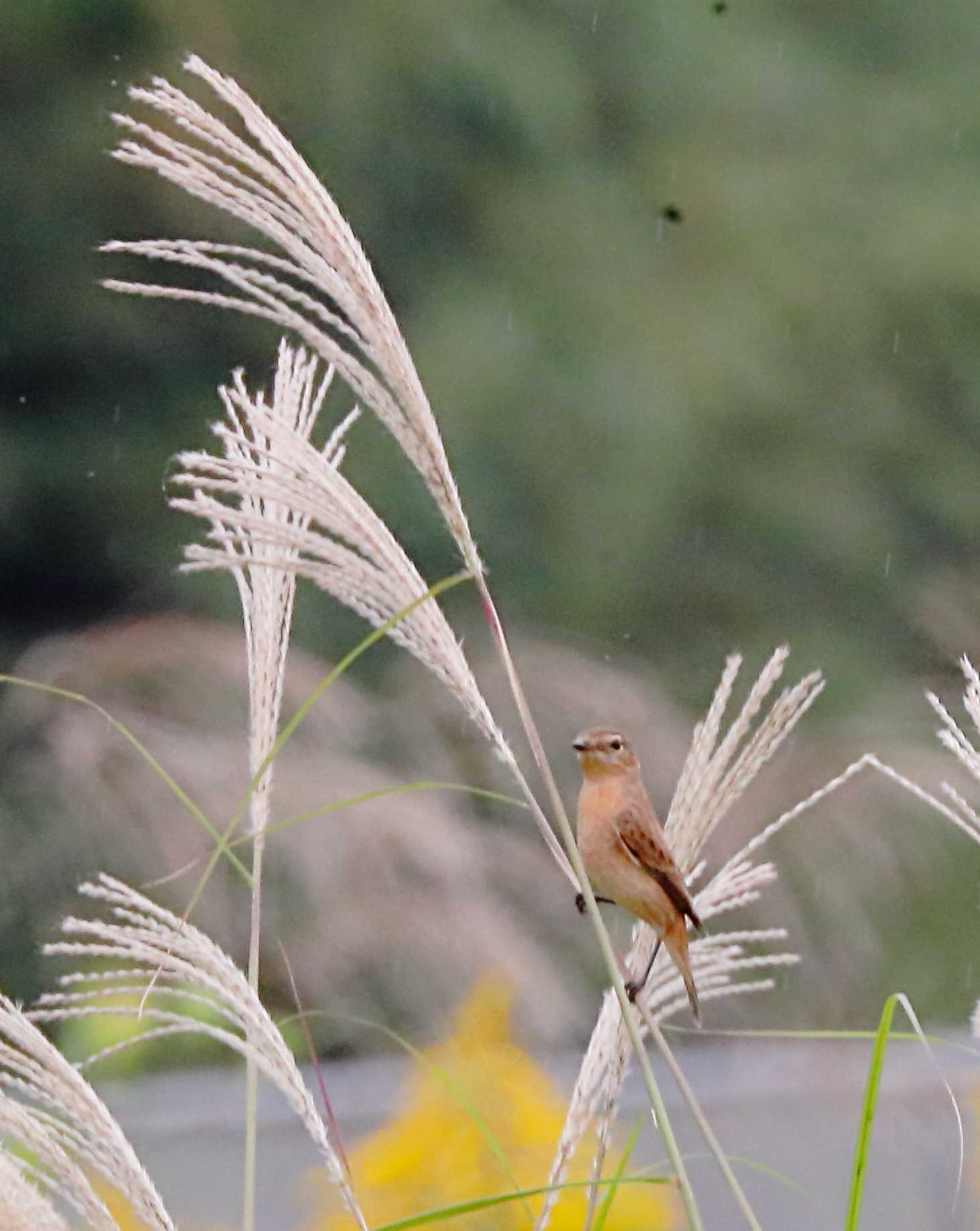 近くの秋桜畑へノビタキ探し曇り空時々雨の中一羽のノビタキが出てきました