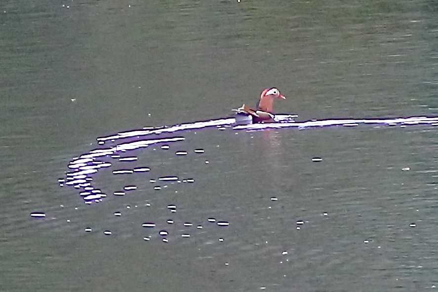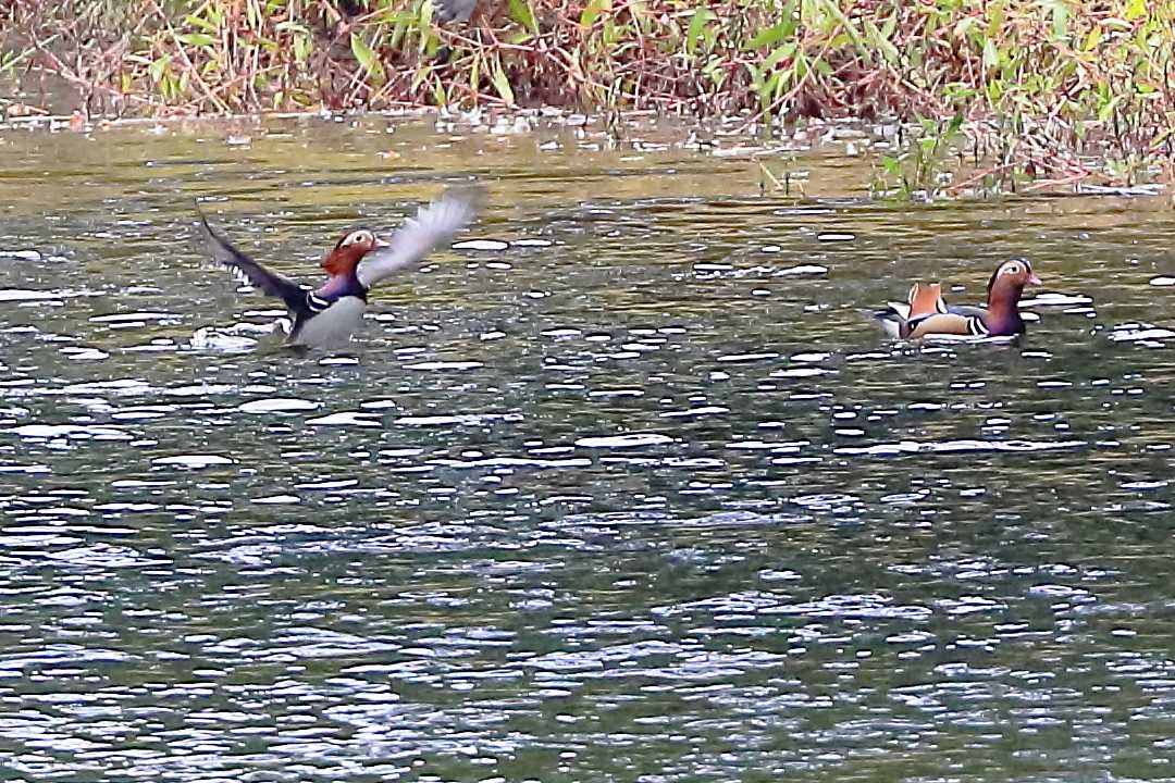 近くの池で鴛鴦まだまだ着いて間もないので警戒心が強いです。すぐに何処かへ飛んでいきます