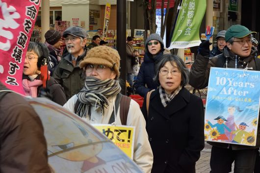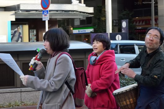 久しぶりの昼デモなので、写真の写りぐあいを心配することはないとたかをくくっていたが、冬日に照らされる勾当台公園の野外音楽堂ではコントラストが強く出すぎるのだった。絞り優先の設定にしてできるだけ光量を絞ったうえで、適当な光量のところでシャッター速度を決めて写せば、狙った被写体のピントが甘くなる。