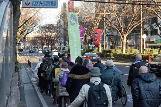 裸参りの行列は、一番町のまん中を静々と進んでいく。反対方向に向かうデモは、その行列に出合うたびに道を譲って道の端を歩くことになる。