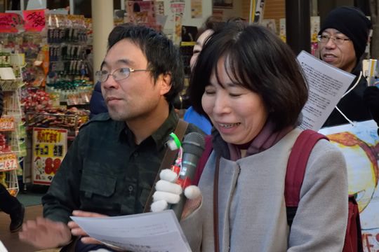 日曜の昼も一番町の人出は多い。夜デモのときに比べれば家族連れが多く、デモに手を振ってくれる人も多い。休日の昼デモの効果はそれなりに大きいに違いない。とはいえ、毎週の休日をデモで過ごせるという人はそんなに多くはないだろう。それにくらべれば、一週に一度、仕事帰りの1時間をデモに割くというのは、負担は少ないだろう。