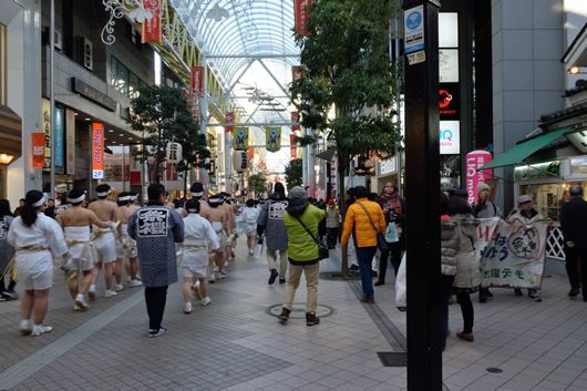 1月14日には、大崎八幡宮の「どんと祭」が行われる。一番町に近づくと、大崎八幡宮に向かう裸参りの行列が次々に一番町から定禅寺通りに左折していく。一つの行列は40人のデモと同じくらいの規模で、30~40人ほどの集団である。ほとんどが、会社や大きな商店の団体である。いまや、裸参りも業務の一つということらしい。