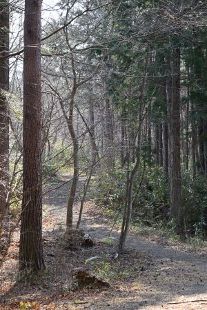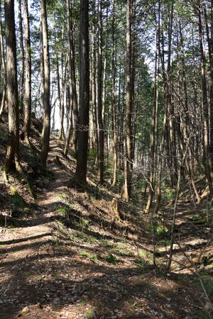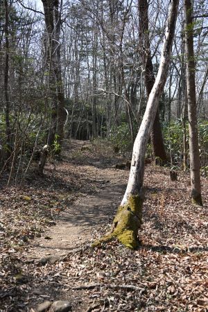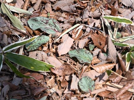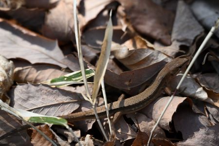 それでも緩やかなアップダウン、ときどき急坂と続く山道は楽しくて快調に歩いていたのだが、首から提げた新しいカメラに仕事をしてもらおうと山道の写真を何枚か撮った。レンズをマクロレンズに交換してセリバオウレンの小さな花も撮った。せっかくなので、葉だけのカタクリも写した。カタクリの葉の近くで枯葉のなかをカサカサと音を立てて歩いているニホンカナヘビがいて、それも写真に収めた。