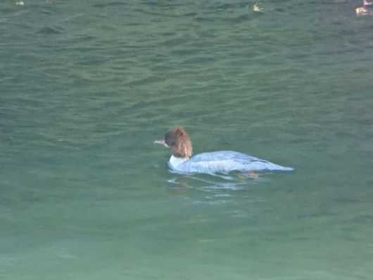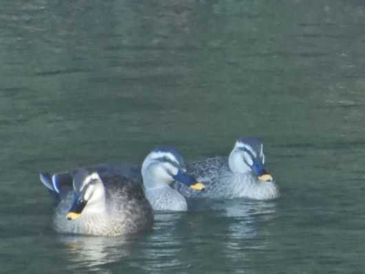 けっこう多くいる。さっそく三脚を広げて覗いてみると見慣れないカモがいる。ちょっと遠いが何とかなるだろうと、ほかのカモにもピントを合わせた。第1陣で飛来したオナガガモとマガモもいたがそれよりも小型の鴨だった。留鳥のカルガモも3羽混じっていた。カルガモを望遠で撮ったのは初めてである。帰宅後調べると、見慣れない鴨は、カワアイサの雌雄だった。