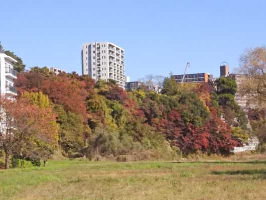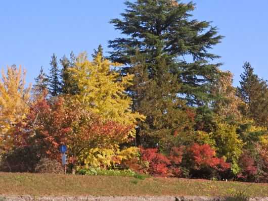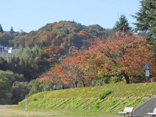 帰り道、見渡せば周囲は紅葉の木々が溢れるように輝いている。見上げる山の上、左岸も右岸も紅葉である。右岸の木々は逆光を受けて輝いている。水が見えれば水鳥をいちおう探すのだが、けっこう満足しているせいか気が入らない。紅葉の写真を撮りながら帰ることになった。