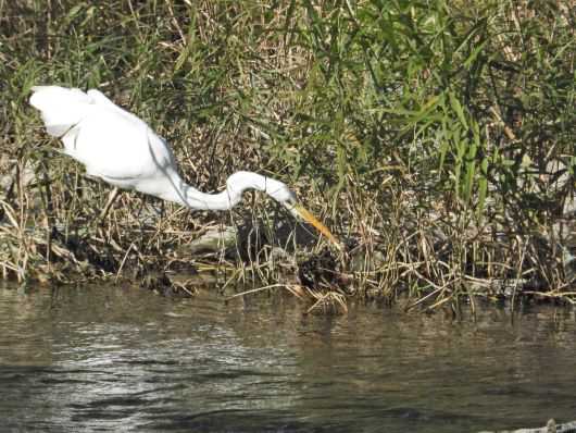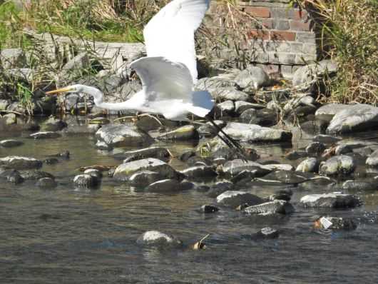 その公園の最上流部は澱橋の真下で、そこから対岸にいるダイサギを写した。ずっと観察を続けて餌をとる姿、最後には飛び立つ姿まで写すことができた。三脚の効果は抜群である。短気なこの私がカメラを抱えて(じっさいは抱えていないが)じっと待つことができるのである。気を良くして澱橋を渡って上流側の澱緑地(河川敷公園)に入る。