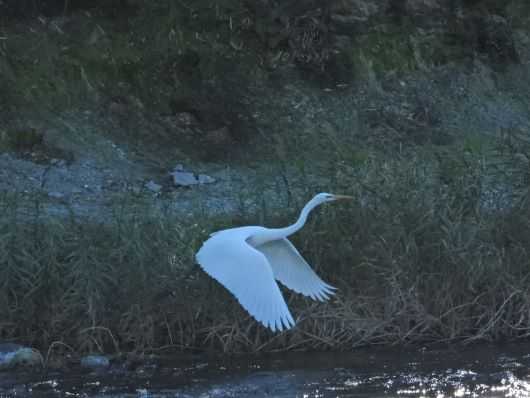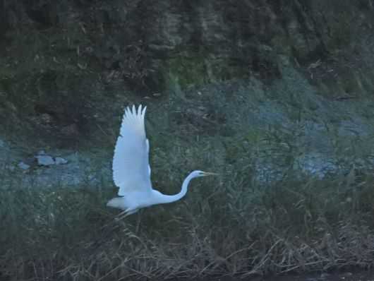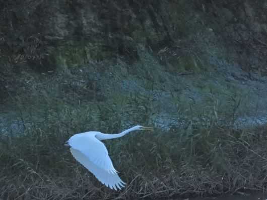 澱緑地でもすぐに対岸のダイサギを見つけた。カメラを覗いてじっと待っていればよいことが起きると念仏のようにくり返し自分に言い聞かせながらじっと待っていると、ダイサギが飛び立ち、その羽ばたく様子をカメラに収めることができた。