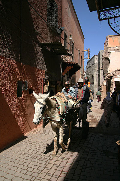 夕暮れ時の帰宅途中、家に向かって歩いていると、ベビーカーに乗った小さな子供とそれを押すお母さんが、私の前方に横切る道を歩いていきました。そこは閑静な住宅街のT字路になっていて、親子の姿は、私の前を通り過ぎるとすぐに家の影になって見えなくなりました。他に歩いている人は誰もいません。私は気にもせず、親子が歩いていった道への角を曲がりました。すると、先に行ったその親子が、ベビーカー共々ぐるりと向きを変え、私のほうを向いて立っていたのです。「ぎえ~~~っっ!」あまりにも予想できなかった事態に、心臓が止まる思いで一瞬立ち尽くしました。次に何が起こるか、あらゆる可能性が頭の中をかけめぐっていきます。そして……ガタンゴトン…ガタンゴトン……ガタンゴトン……パオーーーー私の後ろを、ものすごいスピードで電車が走り抜けていきました。「あ、でんちゃ♪」(ぼうや)「ちょっと見えたわね」(お母さん)その親子は電車が近づいてくるのがわかり、それを見るために待っていたのでした。曲がり角の向こうには気をつけましょう…異国情緒あふれる写真と旅行記|KaycomDESIGNより「メディナの日常」