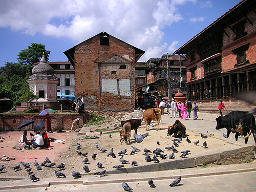 ↓パシュパティナート前の広場牛や猿が放し飼いになっています(ネパール)異国情緒あふれる写真と旅行記|KaycomDESIGNより 初めてネパールのカトマンズに行ったときの第一印象はなんて人と車が多いんだろうということでした。空港でガイドと落ち合い、車でホテルまで連れて行ってもらったのですが、その道中はとてもエキサイティングなものでした。車の割り込み、人の横断、障害物、牛…次々現れるあらゆるモノを、素晴らしい運転技術でよけながら進んでいきます。そして、ところどころに信号があるのですが、どうもなんだか様子がおかしい。赤は止まる、青は進むのはずなのに、それがあまり機能してないような…そう思っているとガイドが一言最近、信号デキマシタ。ミンナ慣レテナイ。ナンデモアリヨなるほど…若干の不安を覚えながらも、早く自由なネパールに慣れなければと心に決めました。