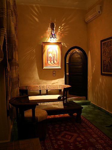 ↓リヤドの部屋マラケシュで宿泊したリヤドの私の部屋(モロッコ)異国情緒あふれる写真と旅行記|KaycomDESIGNより マラケシュのフナ広場のレストランで夕食を済ませてリヤドに戻ると、ちょうどそのリヤドのオーナーが、バイクでどこからか帰ってきたところでした。私たちを発見すると、乗っていたバイクを得意そうに指し示しヤマモトーと外国人特有のアクセントで紹介してくれました。どこかで聞いたことのあるメーカーだなと思いながらバイクを良く見ると、シートの後ろにローマ字でYAMAMOTOと、これまたどこかで見たことのある書体で書いてありました。そうです。YAMA○Aのパクリです。爆笑の私たちに気げんを良くしたオーナーがバイクを指して乗るか?と私に聞いてきました。そして怖がる私を半ば強引に後ろに乗せ、ものすごいスピードで夜のマラケシュを疾走。叫ぶ私。走るヤマモト。道を歩いていた人は、さぞかし変な二人組みだと思ったでしょう。しかし私は、でこぼこ道で暴れるヤマモトから振り落とされないように必死です。もしかしたら、ここで私の旅も終わるかもしれない…と事故った私の変わり果てた姿を見て悲しむ親の顔がちらつきもしましたが、だんだん吹き抜ける風に快感を覚え、最後にはすっかり満足して帰ってきました。ヤマモト最高!