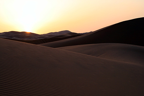 ↓砂漠の夜明けサハラ砂漠で迎えた夜明け(モロッコ)異国情緒あふれる写真と旅行記|KaycomDESIGNより 砂漠の中のテントに泊まり、夜明け前に起床。夜中は風が強くテントがバタバタ音をたてていましたが、今は静かです。星空の下、真っ暗な砂漠を日の出ポイントまで歩いていきます。はじめは寒さで震えていましたが、いくつもの砂丘を越えるうち体が温まってきました。息を切らしながらポイントに到着。シーンと静まる砂漠で夜明けを待ちます。だんだんと、空の色が変わっていきました。藍色から紫、ピンク…そして、一筋の強い光りが砂漠に差し込み、私たちを照らしました。砂漠が赤く染まります。光りと影が作り出す風の模様が砂漠に浮かび上がり、それを崩してはいけないという思いで動くのがためらわれました。砂漠は風もなく静まり返っています。ふと、普段付きまとっているものがないことに気づきました。音人、水、風、虫、車…すべての音がないのです。こんな世界があるんだ…思わぬ発見に、砂漠の夜明けの美しさと共に感動しました。世界は広いですね。