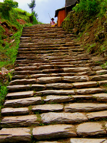 ↓ヒマラヤの道(ネパール)異国情緒あふれる写真と旅行記|KaycomDESIGNにもたくさんの写真があります。 ヒマラヤのアンナプルナ地域の登山道は、綺麗に石が敷かれている部分が多く、とても歩きやすかったです。地元の人たちとすれ違ったりするのですが、みんな親しげに挨拶してくれました。特に子供たちは、外国人の私たちをみるとハローと英語で声をかけてきます。なんで英語なのかと聞いてみたら、英語を話したいけど話す機会がなく、外国人を英語の話し相手にしたいそうです。でも私たちもせっかく覚えた現地語を話したいので、ナマステと返事を返していました。現地の人がハローといい、外国人がナマステと言う…なんともおかしな挨拶が繰り広げられていましたが、それもオツなものです。そんな中でひとつ発見したことがありました。ハローと言うと、子供たちは手を上げますが、ナマステと言うと、顔の前で手を合わせます。(←本来のネパールでの挨拶の仕方)挨拶をする言語によってジェスチャーが変わっていたのです。おそらく無意識だと思いますが、ちょっと微笑ましかったです。