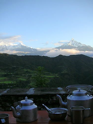 ↓究極のモーニングティーノーダラにある山小屋での朝(ネパール)異国情緒あふれる写真と旅行記|KaycomDESIGNよりヒマラヤトレッキング最終日、朝起きると今までにないいい天気。ひんやりと澄みきった早朝の空気の中、石造りのテラスに出ると、神の住む山マチャプチャレがまっすぐな朝日を浴びてそびえ立っていました。あまりの美しさと荘厳さに立ち尽くしていると、山小屋のおばあさんとおじいさんが起きてきて、座って見れるようにと椅子を用意してくれました。そこに今回同行したシェルパくんが熱くて甘いミルクティーを持ってきてくれて、しばらくの間それを飲みながら、標高6993mの雄姿を眺めていました。来てよかった…「感無量」というのはこういうとき使うのだろうと、正しい使い方を身をもって学んだこの朝飲んだモーニングティーは、おそらく人生の中で、3本の指に入る最高に贅沢なものになったと思います。