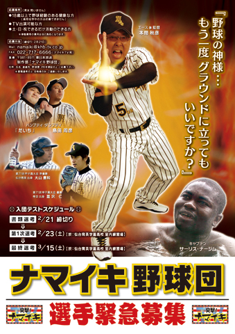 ね~ね~、一緒に野球をやりません???野球好きの方のご応募お待ちしています試合のときには・・・カヨコが皆さんの名前をコールしちゃいます締め切りが21日とりあえず皆さん送ってみましょう~監督はもちろん!本間ちゃんです詳しくは・・・ナマイキ野球団は、本間秋彦さんはじめ出演者を中心に結成。初年度の去年、11月に開催の草野球大会では3回戦敗退と今一歩。準備期間も短く、練習不足も重なり思ったほどの結果を残せませんでした。そこで、今年は広く選手を緊急募集いたします!元気に!楽しく!草野球!いえいえ、数多勝ち進み、あなたのプレーが注目されたその時には、来年の今頃は 「久米島でキャンプ」かもしれません。まずは、はじめの一歩から! さあ、私たちと楽しく野球をしましょう! [応募条件] (男女問いません)●18歳以上で野球経験のある健康な方 (高校在学中の方は応募できません)●TV出演可能な方● 土・日・祝できるだけ活動のできる方※ 移動費等の費用は自己負担となります。[応募方法] (締切り:2月21日)・Mail:http://jp.f37.mail.yahoo.co.jp/ym/Compose?To=namaiki@khb-tv.co.jp・FAX:022-717-6666 (ナマイキTV宛)・ハガキ:〒981-8511 東日本放送 制作部「ナマイキ野球団」住所・氏名・連絡先・野球暦・PRを明記の上ご応募下さい。※書類選考の上、合格者のみ ご連絡致します。【入団テストスケジュール】書類選考 2月21日(木)締切第一次選考 2月23日(土)最終選考 3月15日(土)