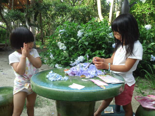 今日はひさしぶりの晴れの日。女の子たちはずっと外の遊びに夢中。。紫陽花がきれいな季節です。薄い青や紫色のグラデーションがなんともいえずきれいです。こどもたちはお花でお誕生日ケーキを作っていました。