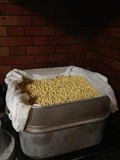 あけましておめでとうございます!!本年も「風のえんがわ」をよろしくお願いいたします。 現在、Cafeのリニューアル工事中の「風のえんがわ」新年1発目は、初めての醤油造り・・・安定してきた、味噌造りに加えて、新たに毎日の生活に欠かせない醤油造りに挑戦!!反田さんのこだわりの大豆を蒸器でふかすところから始まります。 大豆をふかしている間・・・こだわった大豆に対して、麦もこだわりたい・・・とのことで、風のえんがわで手作業で栽培した、ライ麦を、小麦に置き換えて焙煎することにしました。(本当の醤油は大豆と焙煎小麦) 焙煎して石臼でセッセと砕いていたら、あっと意馬に8時間・・・ 砕いた焙煎ライ麦を蒸しあがって40度以下に冷ました大豆に混ぜます。 風のえんがわの燻製でお世話になっている、八王子燻製研究会の燻製機http://www.mytown-club.net/kunken/を応用した製麹マシンで、麹を培養して48時間・・・ほんのり緑色の胞子が出てきたら完成です。 麹が完成したら、計量し、塩分濃度が16%~17%の間になるよう塩水を加えます。 最後はしっかりと撹拌し、乳酸菌と酵母を足すために「風のえんが味噌」を加えて、空気が入らないようビニール袋で覆います。始めてなのに、小麦をライ麦に置き換えてしまいましたが・・・ライ麦特有の酸味などはほとんど無く、美味しい・・・これだけ手を加えたのからかなのか??(笑)とにかく、これからの熟成期間が楽しみです。また、発酵が始まったら報告します。